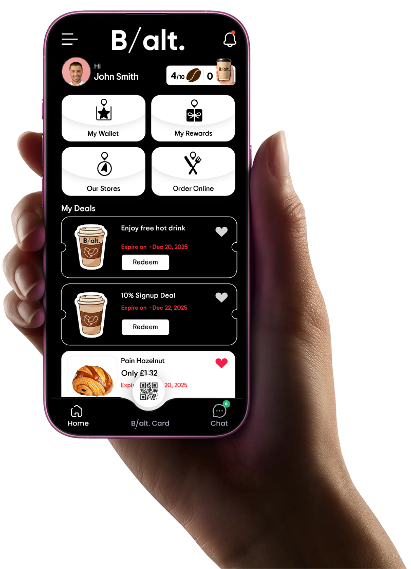 B/alt Loyalty scheme is our way of saying thank you for your support. Simply collect loyalty stamps every time you order a hot drink or benefit from our reward scheme every time you shop at our stores! Check out the B/alt Loyalty Benefits Explained tab at the bottom of the page for detailed explanation.