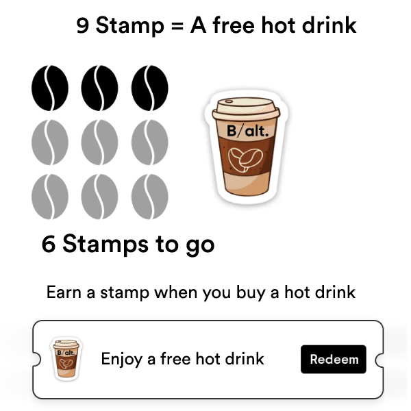 B/alt Loyalty scheme is our way of saying thank you for your support. Simply collect loyalty stamps every time you order a hot drink or benefit from our reward scheme every time you shop at our stores! Check out the B/alt Loyalty explained